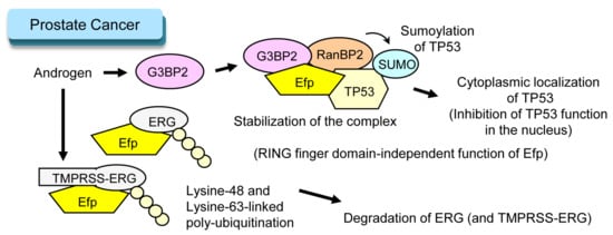ERG is a protein encoded by a gene called E-twenty-six (Ets)-related gene (ERG). In prostate cancer, ERG often forms a fusion gene with transmembrane protease, serine 2 (TMPRSS2) [35]. Since TMPRSS2 is an androgen-dependent gene, the fusion protein encoded by TMPRSS2/ERG is overexpressed in prostate cancer, which contributes to tumor progression [35]. Efp was shown to interact with the ERG protein and caused RING-finger-domain-dependent poly-ubiquitination of the ERG protein, which led to degradation of the ERG protein [36]. It was also shown that Efp was able to interact with ERG protein without an N-terminus region, lacking in the protein encoded by TMPRSS2/ERG fusion gene. Considering the pathological role of the TMPRSS2/ERG fusion gene, this function of Efp could seem to be tumor suppressive (Figure 2).