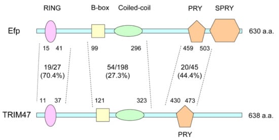 The functions of Efp and their pathophysiological importance led our interest to the roles of other TRIM family proteins that share a similar structure with Efp. According to a phylogenetic analysis of the PRY/SPRY domain that often exists in the C-terminal region of TRIM family proteins, the Efp protein has similar structure to TRIM65, RIPLET, TRIM16, TRIM16L, and TRIM47 [4]. Among these, we focused on TRIM47, which was recently shown to be related to endocrine resistance in breast cancer [5]. The numbers of identical amino acids to Efp in each domain of TRIM47 are indicated in Figure 3. Based on the homology search using BLAST (basic local alignment search tool) provided by NCBI (National Center for Biotechnology Information; https://www.ncbi.nlm.nih.gov/ accessed on 12 January 2022), TRIM47 shares identical amino acids with Efp in 19 out of 27 amino acids (70.4%) in the region including the RING finger domain, 54 out of 198 (27.3%) in the region including B-box and coiled-coil domains, and 20 out of 45 (44.4%) in the region including PRY domain (Figure 3).
