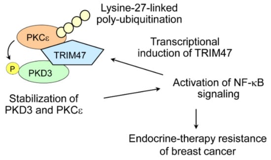 In terms of hormone-dependent cancers, we previously showed that TRIM47 is a poor prognostic factor for prostate cancer patients [65]. As for breast cancer, two independent studies including ours showed tumor promoting effects of TRIM47 [5,66]. We demonstrated that overexpression of the TRIM47 protein predicted poor prognosis in ER-positive breast cancer patients, and that overexpression of TRIM47 caused endocrine-therapy-resistant growth in breast cancer cell lines [5]. In contrast to Efp, TRIM47 is not induced by estrogen. In fact, expression of TRIM47 was induced by NF-κB signaling. On the other hand, we showed TRIM47 causes activation of NF-κB signaling, forming a positive feedback loop (Figure 4). Our results were in line with previous reports that showed that enhanced NF-κB signaling is one of the causes of endocrine resistance in breast cancer [67,68]. Mechanistically, TRIM47 was associated with two kinases, namely protein kinase C epsilon (PKCε) and protein kinase D3 (PKD3), both of which are known to activate NF-κB signaling [69,70]. TRIM47 increased the stability of these two kinases and this effect was RING finger domain dependent. We revealed TRIM47-dependent PKCε ubiquitination involves atypical lysine-27-linked poly-ubiquitination [5]. In this model, stabilization and activation of PKD3 can be explained by phosphorylation of PKD3, since PKD3 was reported to be phosphorylated by PKCε in prostate cancer cells [71]. Thus, TRIM47 serves as a scaffold to bring PKD3 in proximity to PKCε (Figure 4).