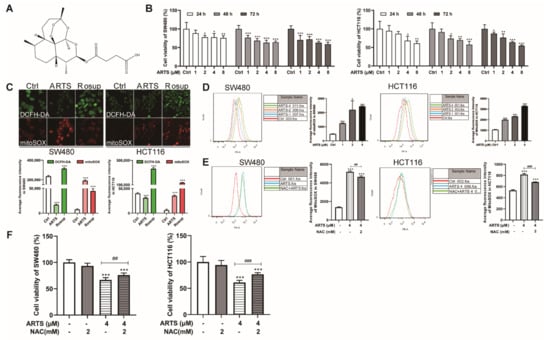 Artesunate inhibited cell viabilities partially due to excessive mitochondrial ROS. (A) The endoperoxide structure of artesunate. (B) Artesunate inhibited cell viabilities of SW480 and HCT116 dose-dependently. The colorectal cancer cell lines, SW480 and HCT116, were seeded in 96-well plates and treated with artesunate at 1, 2, 4, and 8 μM for 24, 48, 72 h. Cell viabilities were detected via CCK8 assay. (C) Artesunate caused mitochondrial ROS generation. Cells were seeded in glass-bottomed dishes and treated with artesunate (4 μM) for 72 h. DCFH-DA (Green) and MitoSOXTM Red (Red) was used to label the total intracellular ROS and mitochondrial specific ROS respectively. Images were captured by confocal microscope (Scale bar = 25 μm). Rosup was used as a positive agent of ROS inducer. (D) Mitochondrial ROS was increased dose-dependently. Cells were probed with MitoSOXTM Red after artesunate treatment. The fluorescence intensity of MitoSOXTM Red was record by flow cytometry to indicate the mitochondrial ROS level. The ROS scavenger NAC helped to (E) decrease the mitochondrial ROS, and (F) restore cell viabilities in treated SW480 and HCT116. NAC was used at a concentration of 2 mM and added alone or together with artesunate (4 μM) for 72 h before cell viability assay and MitoSOXTM Red incubation. * p < 0.05, ** p < 0.01, and *** p < 0.001 vs. Ctrl. ## p < 0.01, and ### p < 0.001 vs. cells treated with artesunate alone. Data were shown as mean ± SD.