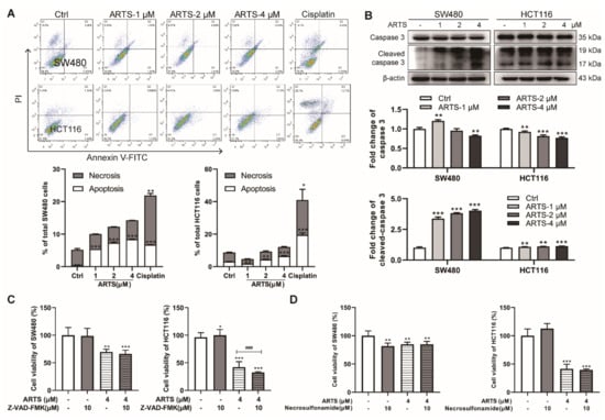 Artesunate-induced mild apoptosis could not help to inhibit cell viabilities of SW480 and HCT116. (A) Artesunate only induced mild apoptosis in SW480 and HCT116. Cells were seeded in 6-well plates and treated with artesunate (1, 2, and 4 μM) for 72 h. Afterwards, all cells (suspended and attached) were harvested. After incubation with anti-Annexin V-FITC primary antibody and PI solution, apoptotic cells were detected via flow cytometry. Cisplatin was used as positive drug for cell apoptosis at a concentration of 30 μM for 24 h. (B) Artesunate upregulated the protein level of cleaved-caspase 3 in SW480 and HCT116. Cells were seeded in 60 mm dishes and treated with artesunate (1, 2, and 4 μM) for 72 h. Then, cells were lysed with RIPA to extract total protein. The protein levels were measured by western blotting. The gray values of protein blots were evaluated by Image J. Relative protein expression was normalized to β-actin. (C) Z-VAD-FMK, a pan-caspase inhibitor, and (D) necrosulfonamide, a necrosis inhibitor, could not help to restore cell viabilities. Z-VAD-FMK and necrosulfonamide were used at a concentration of 10 μM and added alone or together with artesunate (4 μM) for 72 h. Cell viabilities were detected via CCK8 assay. * p < 0.05, ** p < 0.01, and *** p < 0.001 vs. Ctrl. ### p < 0.001 vs. cells treated with artesunate alone. Data were shown as mean ± SD.