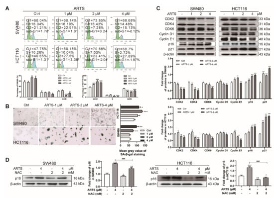 When cells were co-treated with artesunate and NAC, the number of SA-β-gal-positive cells and the accumulation of the x-gal-sourced blue product were less than that in cells treated with artesunate only (Figure S1D). Additionally, the protein level of p16 in artesunate-treated cells was markedly downregulated by NAC co-treatment (p < 0.001, Figure 3D). These results suggested that artesunate induced cell senescence and inhibited cell proliferation, to some extent, partially in a ROS-dependent manner. Comparatively, NAC exhibited a greater inhibitory effect on p16 protein expression in HCT116.