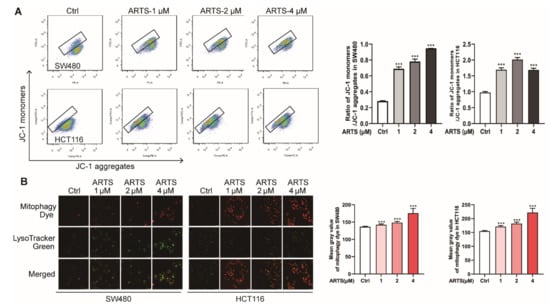 Artesunate promoted mitochondria depolarization and resulted in mitophagy. (A) Artesunate caused mitochondria depolarization. Cells were seeded in 6-well plates and treated with artesunate (1, 2, 4 μM) for 24 h and then incubated with JC-1. The average intensity of green fluorescence from cytoplasmic JC-1 monomers and the red fluorescence from JC-1 aggregates was recorded by flow cytometry. The ratio between JC-1 monomers and JC-1 aggregates represented mitochondria depolarization and the damaged mitochondrial membrane permeability. (B) Artesunate induced mitophagy in SW480 and HCT116 dose-dependently. Cells were seeded in glass-bottomed dishes. Cells were loaded with mitophagy dye before artesunate treatment. After being treated with artesunate (1, 2, and 4 μM) for 72 h, images were captured immediately by confocal microscope (Scale bar = 25 μm). The intensity of red fluorescence was calculated by Image J. *** p < 0.001 vs. Ctrl. Data were shown as mean ± SD.