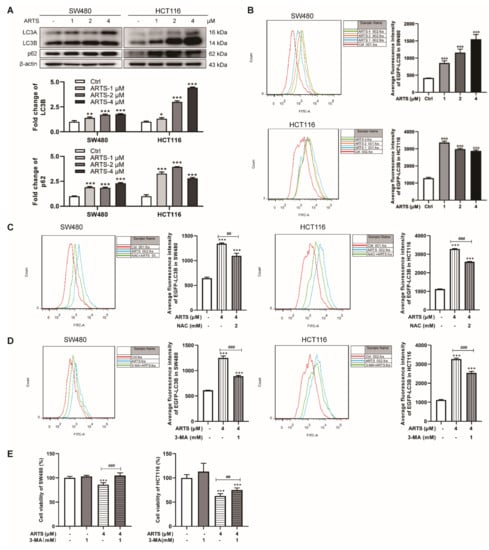 The effect of artesunate on the expression of LC3B was further confirmed by a pEGFP-LC3B-C5 plasmid. The expression level of exogenous LC3B, which fused with EGFP, was quantified by the fluorescence intensity of EGFP. As illustrated in Figure 5B, the fluorescence intensity of EGFP-LC3B in transfected and treated SW480 cells was approximately 2.10 ± 0.16 (1 μM, p < 0.001), 2.77 ± 0.25 (2 μM, p < 0.05), and 3.71 ± 0.22 (4 μM, p < 0.001) times greater than that in transfected cells without treatment, while in HCT116 cells, it was approximately 2.62 ± 0.07 (1 μM, p < 0.001), 2.32 ± 0.04 (2 μM, p < 0.001), and 2.24 ± 0.04 (4 μM, p < 0.001) times greater.