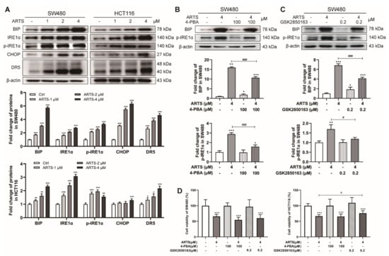 4-PBA (an ER stress inhibitor) and GSK2850163 (an IRE1α inhibitor) were applied to verify the effects of artesunate on ER stress and IRE1α-mediated UPR. 4-PBA and GSK2850163 reduced the levels of BIP and phosphorylated IRE1α in SW480 and HCT116 cells (Figure 6B,C and Figure S4B,C). The levels of XBP1S and DR5 were also reduced by GSK2850163 and 4-PBA (Figure S4D,E). However, the results of the CCK-8 assay revealed that GSK2850163 could only restore the viability of HCT116 cells by approximately 14.33% ± 12.09% (p < 0.05, Figure 6D).
