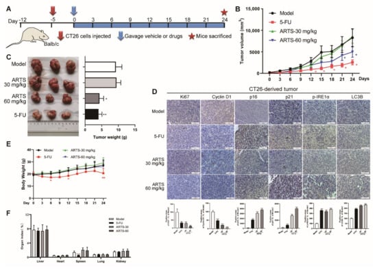 Artesunate inhibited the growth of CT26-derived tumor in vivo. (A) Experimental timeline of CT26-derived tumor model in balb/c mice. Balb/c mice were injected CT-26 cells (1 × 105 cells for each mouse) subcutaneously to establish the CT26-derived tumor model. Tumor-loaded mice were gavaged with artesunate at 30 mg/kg or 60 mg/kg for 24 days. Body weights and tumor volumes were recorded every three days. (B) Curve of tumor volume. (C) Tumor weight. Tumor tissues were collected and weighted after treatment. (D) Immunohistochemical images of Ki67, Cyclin D1, p16, p21, LC3B, and p-IRE1α. Immunohistochemistry assay was performed using a SABC-POD staining kit. (E) Curve of body weight. (F) Organ indexes. Lung, heart, spleen, liver, and kidney were collected and weighted to calculate the organ indexes after treatment. * p < 0.05, *** p < 0.001 vs. Model group. Data were shown as mean ± SD.