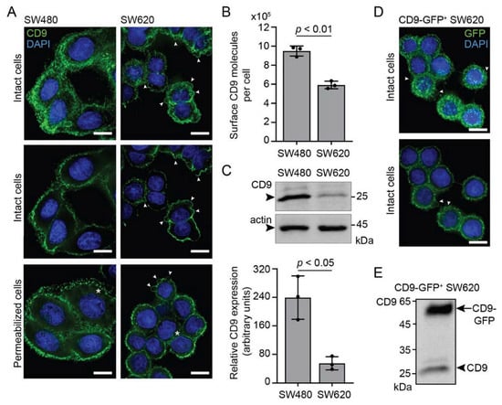 CD9 expression in SW480 and SW620 cells. (A) CD9 expression was investigated by indirect immunofluorescence labeling using anti-CD9 5H9 Abs on either intact or permeabilized SW480 and SW620 cells cultured on poly-D-lysine-coated dishes. Nuclei were stained with DAPI and samples were observed by CLSM. Composite images (top panels) or single x-y sections (middle and bottom panels) are shown. Arrowheads indicate membrane blebs, while asterisks mark cytoplasmic CD9 immunoreactivity. (B) The amount of surface CD9 antigens per cell detected with FITC-conjugated eBioSN4 Abs was estimated using a flow cytometer calibrated with fluorescent microparticles. (C) Total CD9 antigens were analyzed by immunoblotting (top panel) using 5H9 Abs and quantified (bottom panel). The samples were normalized to β-actin. Molecular mass markers (kDa) are indicated. Arrowhead indicates the protein of interest. (D,E) SW620 cells stably transfected with CD9-GFP were analyzed either by fluorescence microscopy without permeabilization (D) or immunoblotting (E). For the microscopy, nuclei were stained with DAPI and samples were observed by CLSM. A composite image (top panel) or a single x-y section (bottom panel) is displayed. Arrowheads indicate membrane blebs. For immunoblotting, the membrane was probed with 5H9 Abs. The arrow and arrowhead indicate the CD9-GFP fusion protein and the endogenous CD9, respectively. Means ± S.D. and individual values for each experiment are shown (n = 3). p values are indicated. Scale bars, 10 µm.