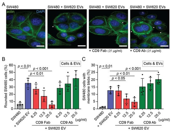 To assess whether CD9 Fab negatively interfered with the pro-metastatic morphological alterations of SW480 cells induced by SW620 cell-derived EVs, we co-incubated them in the presence or absence of Abs using three distinct protocols (Supplementary Figure S1) and then determined their phenotypic modification, i.e., cell rounding and induction of membrane blebs. In the first set of experiments, following protocol #1, both cells and EVs were pre-incubated with either monovalent CD9 Fab or divalent Ab (25 µg/mL) for 30 min. Cells and EVs were then co-incubated for a period of 5 h. SW480 cell morphology was determined by fixing and staining them with fluorochrome-conjugated phalloidin and DAPI to label actin filaments [67] and nuclei, respectively, prior to CLSM analysis. As negative and positive controls, we used SW480 cells and those incubated with SW620 cell-derived EVs, respectively. In the latter, we observed cellular transformation with the appearance of rounded cells and membrane blebbing (Figure 4A). Quantification revealed that both phenotypes were infrequently detected in those not incubated with EVs (Figure 4B,C, respectively). The addition of CD9 Fab (25 µg/mL) significantly reduced EV-mediated cell transformation, a phenomenon also observed at lower concentrations (Figure 4A–C). In contrast, the divalent CD9 Ab did not interfere with such processes (Figure 4A–C). Similar results were obtained when co-incubation of cells and EVs was increased to 16 h (Supplementary Figure S4).
