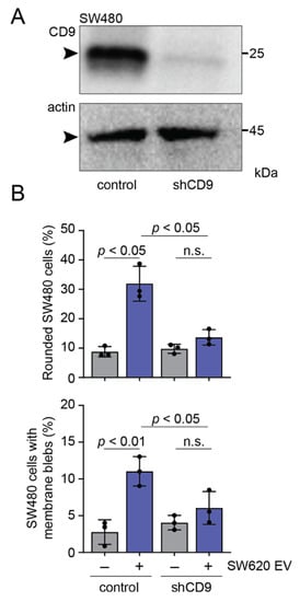 All data described so far suggest that CD9 Fab blocks EV-mediated transfer of morphological traits from SW620 to SW480 cells. However, we do not know whether CD9 per se is involved in this process, particularly in the initial binding of EVs to the surface of SW480 cells. To address this issue, we silenced its expression in SW480 cells using shRNA technology. As shown by immunoblotting (Figure 6A), approximately 91 ± 2.7% (n = 3) of CD9 is reduced in shCD9 cells compared to parental cells. CD9 knockdown did not affect the overall mesenchymal-like spreading morphology of SW480 cells (data not shown), suggesting that CD9 is not the only player involved in this phenotype (see Discussion). We then co-incubated them with SW620 cell-derived EVs for 5 h and determined their morphological alterations. Interestingly, EV-induced rounded morphology and membrane blebbing were prevented in shCD9 cells (Figure 6B,C, respectively), suggesting that cell-associated CD9 is involved in the initial binding of CD9 EVs and/or their internalization and upstream events.