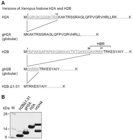 The plasmids for expression of recombinant X. laevis histones (intact and globular, pET3a plasmid) were obtained from Dr. Karolin Luger []. The plasmid for expression of recombinant histones H2BΔ1-31 was constructed by the following procedure. The DNA fragment of H2BΔ1-31 was amplified by a PCR reaction using pET3a-gH2B as a template. The PCR product of H2BΔ1-31 DNA was then ligated to the pET3a plasmid through the ends generated after digestion with restriction enzymes BamH I and NdeI (New England Biolabs, Ipswich, MA, USA) by T4 DNA Ligase (Promega, Madison, WI, USA). All sequences of primers and templates will be provided upon request.