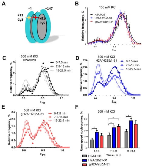 Core nucleosomes were assembled using 603 DNA template fluorescently labeled at positions +13 and +91 bp with Cy3 and Cy5 fluorophores, respectively, and then purified by non-denaturing PAGE. The single-particle Förster resonance energy transfer (spFRET) measurements were performed in the buffer (10 mM Tris-HCl pH 8.0, 0.5 mM EDTA) containing 0.15 M KCl as described in []. For the time course analysis at higher ionic strength, nucleosomes were diluted to a concentration of 1 nM in the buffer with 0.5 M KCl and measured by spFRET microscopy during the time periods of 0–7.5, 7.5–15, and 15–22.5 min after dilution [,].