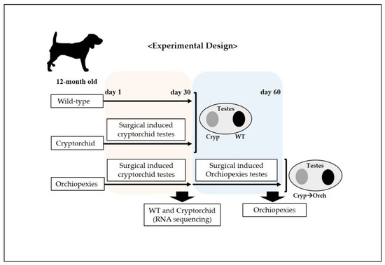 On experiment day 1, we performed surgery to induce unilateral cryptorchidism, where one testicle did not descend in all dogs in the experiment. The testicle on which surgery was not performed was used as the wild-type control.