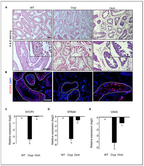 We conducted an immunostaining analyses to assess the expression of synaptonemal complex protein 3 (SYCP3), retinoic acid 8 (STRA8), and VASA, all of which had meiotic markers that are expressed in spermatocytes in testes tissues. SYCP3-positive spermatocytes were abundant in wild-type testes but not in cryptorchid testes. These results indicate that few cells within the tubules in cryptorchid testes are not spermatocytes. SYCP3-positive cells were also found in orchiopexied testes (Figure 2B). The expressions of SYCP3, STRA8, and VASA were significantly and consistently decreased in cryptorchid testes compared to wild-type and orchiopexied testes (Figure 2C). These results indicate that male germ cells were significantly reduced by surgically induced cryptorchidism and that testes function and spermatogenesis resumed after orchiopexy.