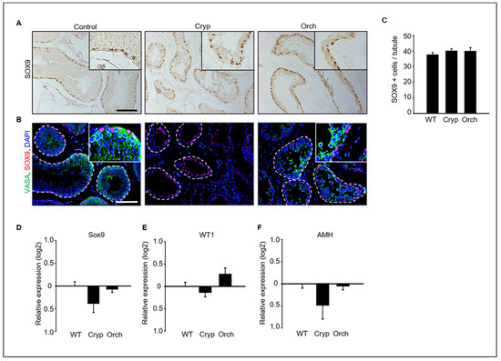 (A) SOX9, a Sertoli cell marker protein, was detected in wild-type, cryptorchid, and orchiopexied dog testes by DAB staining. SOX9-positive cells were found in all samples. (B) Both SOX9 and VASA, a germ cell marker, were detected in all three groups. VASA- and SOX9-positive cells were not exactly overlapped in wild-type testes; VASA-positive cells were not observed in cryptorchid testes. Scale bars = 50 μm; n = 3, two pairs of testes. (C) The average number of SOX9-positive Sertoli cells in the tubules was counted based on immunostaining from three different samples. At least 40 tubules were scored for each slide, for a total of 3 biological replicates. Data are presented as the mean ± standard deviation; no significant difference was found. Status of Sertoli cells in wild-type, cryptorchid, and orchiopexied dog testes. The expression levels of (D) SOX9, (E) Wt1, and (F) AMH genes were detected by qPCR.