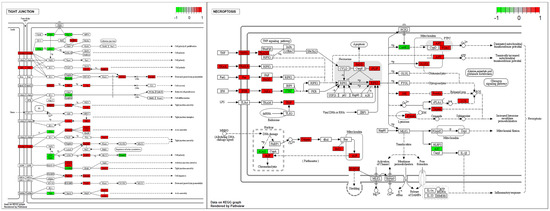 The expression pattern of DEGs involved in the tight junction and the necroptosis pathways. The DEGs were mapped by R package pathview. The box color represents the different regulations of genes with log FC value (red; upregulation, green; downregulation).