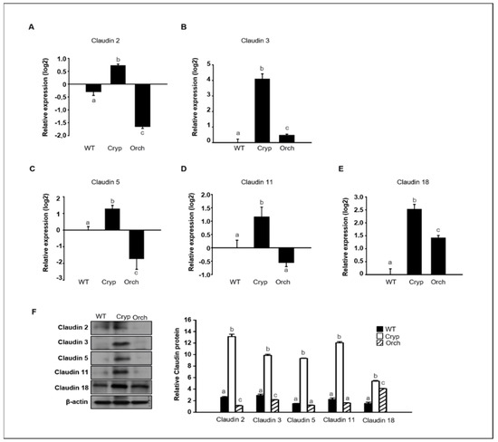 The relative expression of claudins in wild-type, cryptorchid, and orchiopexied dog testes. The expression of (A) claudin-2, (B) claudin-3, (C) claudin-5, (D) claudin-11, and (E) claudin-18 genes were detected in wild-type, cryptorchid, and orchiopexied dog testes. The expression levels of these genes are significantly increased in cryptorchid testes compare to wild-type. Data are presented as means ± standard deviation. Values with different letters are significantly different (F) protein levels of claudins 2, 3, 5, 11, and 18 were also analyzed via immunoblot analysis. The values of all protein levels were normalized to that of β-actin. Results are expressed as mean ± standard deviation. Values with different letters are significantly different. These results are consistent with the data from our qPCR analysis.
