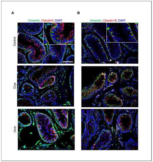 In addition, the relative expression of claudins 3 and 18 in wild-type, cryptorchid, and orchiopexied dog testes was assessed by immunostaining using commercially available antibodies. Claudins 3 and 18 were present in the cell membrane near the basement membrane. Furthermore, cells that were positive for claudins 3 and 18 were also partially colocalized with Sertoli cells that were marked with vimentin (Figure 7).