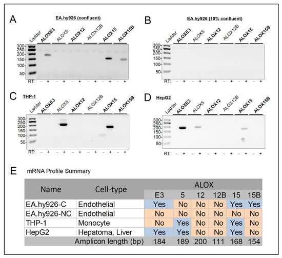 ALOX mRNA profile of confluent EA.hy926, non-confluent EA.hy926, THP-1, and HepG2 cells. (A–D): Agarose gel images showing ALOX-specific RT-PCR products for confluent EA.hy926 cells (A), non-confluent EA.hy9256 cells (B), THP-1 cells (C) and HepG2 cells (D). RT, reverse transcriptase. (E): Table summarizing the ALOX expression profile in the different cell types. C, confluent; NC, non-confluent. Blue colour-coding indicates the presence of ALOX mRNA; orange colour-coding indicates ALOX mRNA is absent.
