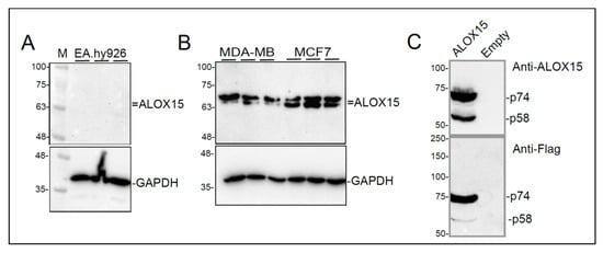 The HPA transcriptome database was screened for cancer cell lines expressing high-levels of ALOX15 to use as positive controls for ALOX15 protein expression. High ALOX15 mRNA levels were identified in metastatic breast tumor-derived epithelial-like MCF7 cells [40]. MDA-MB231 cells, which were established from pleural effusions from breast cancer patients [41], were also used for this purpose. Immunoblotting using anti-ALOX15 antibody revealed the presence of two immunoreactive bands in the 63–75 kDa range in lysates from both MCF7 and MDA-MB231 cells (Figure 2B).