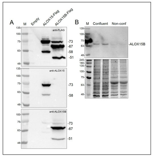 The 73 kDa ALOX15B band corresponds to the theoretical molecular weight of ALOX15B (72.5 kDa) calculated with the ExPASy Compute pI/MW tool [42]. However, ALOX15B has in-frame alternative second and third AUG start codons that can generate 56.5 and 50.8 kDa proteins, respectively (Figure S3). The presence of p73, p67, and p51 bands in ALOX15-Flag overexpressed cells indicated that all three start codons are used during translation, although it would appear that the second alternative start codon was the most active based on their relative band intensities (Figure S3A). Of note, the 57 kDa ALOX15B-Flag appeared at 67 kDa with respect to the molecular weight markers, likely due to the presence of post-translational modifications.