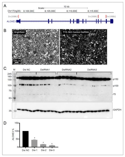 Dicer-Substrate siRNAs (DsiRNAs), which are chemically synthesized 27mer RNA duplexes, exhibit RNA knockdown potency up to 100-fold more than conventional 21mer siRNAs [44]. Three sets of DsiRNA, each targeting a different exon of the ALOXE3 gene (Figure 4A), were designed and transfected into HEK293 cells. Immunofluorescence images of the fluorescence-conjugated control DsiRNA (Dsi NC) revealed high transfection efficiency was achieved using lipofectamine (Figure 4B). Immunoblotting for ALOXE3 revealed knock down by the three DsiRNAs only affected the 100 kDa band (Figure 4C), while the levels of the 70 and 150 kDa bands remained constant. These results indicate that the 70 and 150 kDa immunoreactive bands are non-specific and that the 100 kDa immunoreactive band represents the ALOXE3 protein. Quantification of the 100 kDa band intensities after normalization to GAPDH revealed that DsiRNA3 was the most effective in knocking down ALOXE3 (Figure 4D). Interestingly, the identification of the 100 kDa band as ALOXE3 (protein ID: ENSP00000314879) suggests it may be post-translationally modified since the apparent molecular mass is higher than the predicted size of 80 kDa, based on calculations with the ExPASy Compute pI/MW tool [42]. However, use of an in-frame alternative second AUG start codon may cause translation of a 76.2 kDa (theoretical) ALOXE3 protein (Figure S4B), even though transcriptional isoforms are not listed in the Ensembl human genome assembly (GRCh38.p13) database [45].