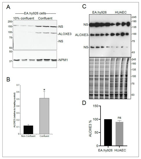 Relative levels of ALOXE3 in confluent and non-confluent EA.hy926 endothelial cells and in confluent HUAEC endothelial cells. (A): Lysates of EA.hy926 cells that were either 10–20% confluent or 100% confluent were prepared in triplicate and immunoblotted for ALOXE3 and NPM1 (loading control). Representative blots are depicted in the figure. NS: non-specific bands. (B): Bar graph showing the relative levels in confluent and non-confluent EA.hy926 cells of ALOXE3 (100 kDa band) based on densitometry of the bands in panel A normalized to NPM1. Data represent mean ± SEM. N = 3, from 2 independent experiments. Data were analyzed by t-test (unpaired). *, p ≤ 0.05. (C): Immunoblot (top panel) showing levels of ALOXE3 in confluent EA.hy926 compared to confluent HUAEC. Total protein was visualized with Oriole stain (bottom panel) to show relative protein loading. NS: non-specific bands. (D): Bar graph showing densitometric quantification of ALOXE3 in EA.hy926 cells and HUAEC after normalization to protein load. Data are presented as mean ± SEM. N = 8 replicates. Data were analyzed by t-test (unpaired). ns: not significant (p > 0.05).