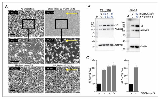 In addition to cell contact, endothelial cell growth and activation can be influenced by blood flow. Specifically, shear stress can induce endothelial cell quiescence much like cell contact [46]. To see if ALOXE3 expression can be modulated by shear stress, confluent EA.hy926 were exposed to shear forces of 0, 8, 14, and 30 Dyn/cm2 for 24 h, which approximate the physiological forces observed in veins, ascending aorta, and arteries, respectively [9]. Brightfield microscopy revealed that application of shear force for 24 h led to a loss of confluency and formation of isolated patches of 4–20 cells (Figure 6A). This occurred under all conditions, however, only 30 Dyn/cm2 is shown. In contrast, HUAECs exposed to 30 Dyn/cm2 (lower shear forces were not tested) remained confluent (Figure 6A). These results suggest that there is a cell-type-specific response with respect to cell–cell contact and adherence under shear stress. This difference may also be due to the transformed somatic hybrid nature (lung epithelial and endothelial) of EA.hy926 cells compared to the primary HUAEC. However, immunoblotting revealed that ALOXE3 levels increased in response to shear force in both EA.hy926 cells and HUAEC, regardless of the force applied (Figure 6B). Quantification of the immunoblots revealed ALOXE3 was significantly increased by 3.2-fold under shear stress conditions (Figure 6C). These novel findings indicate that the abundance of ALOXE3 protein in endothelial cells is responsive to both shear stress and cell growth state.