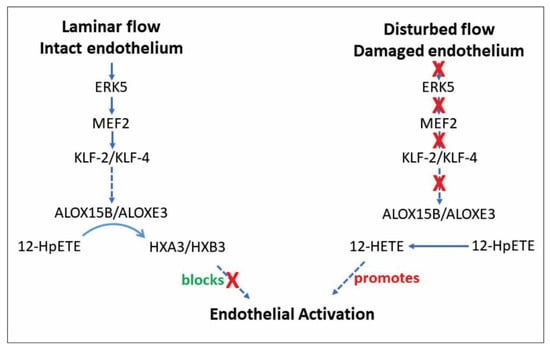 An examination of the intracellular pathways that regulate ALOX15 and ALOXE3 levels in endothelial cells has not been included in this study. In large part, this deficiency is due to the lack of information currently available regarding lipoxygenase expression, and in the absence of a credible target such an investigation would be impractical. However, based on the findings of this study, some speculation on this topic is possible. Shear stress as a result of laminar flow is a critical factor in maintaining the endothelial state. Specific mechanosensitive ion channels, such as PIEZO1, convey the mechanical effects of flow to a CaMKII-ERK5 signal transduction cascade that modulates expression of the endothelial-specific transcription factors KLF-2 and KLF-4 [80]. Furthermore, recent evidence suggests that ERK5 operates by phosphorylating MEF2, the transcription factor that controls KLF-2 and KLF-4 gene activity [81]. While a role for KLF-2 and KLF-4 in ALOX15B or ALOXE3 gene expression has not yet been identified, Segre et al. [82] have reported that KLF-4 governs the epidermal barrier function, a process which also involves ALOXE3 [63]. Conversely, disturbed flow leads to a reduction in KLF-2 and KLF-4 and conversion to the activated state [83], where ALOX15B and ALOXE3 are lacking (Figure 7). Consequently, as described above, 12-HpETE and 15-HpETE would preferentially be metabolized to 12-HETE and 15-HETE, respectively, which disrupt barrier function via PKCε-mediated phosphorylation of ZO-1 [69]. The loss of barrier function is considered to be the first step in EndMT, which is essential for vascular repair, but it can also result in endothelial dysfunction and atherosclerosis [55]. It is likely that modes of injury other than disturbed flow, including mechanical damage, also lead to EndMT, although they would engage via a distinct set of signal transduction pathways [84]. Once repair is complete, other lipid metabolizing enzymes contribute to the resolution phase of vascular wound healing [11], and these molecules likely promote restoration of the quiescent endothelial state and re-expression of KLF-2 and KLF-4.