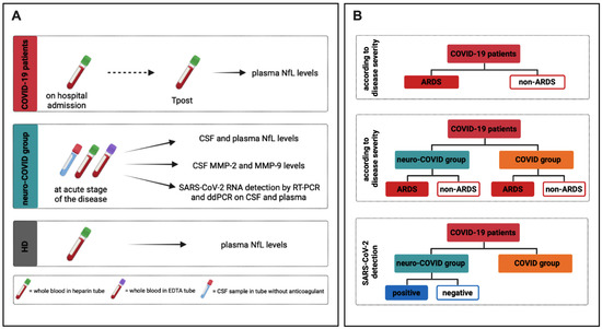 Figure 1. Study design. (A) For COVID-19 patients, whole blood samples were collected in heparin tubes during routine clinical testing at two timepoints: on hospital admission (baseline) and after three months from discharge (Tpost). For the neuro-COVID group, CSF samples and heparin and EDTA whole blood samples were collected. RT-PCR and ddPCR were used for the detection and quantification of SARS-CoV-2 RNA in collected CSF and whole blood samples. For healthy donors (HD) heparin whole blood samples were collected. (B) According to clinical outcome, COVID-19 patients were stratified into ARDS and non-ARDS groups and the differences in plasma NfL levels were evaluated. According to disease severity, both neuro-COVID group and COVID groups were stratified into ARDS and non-ARDS groups and the differences in CSF NfL levels, plasma NfL levels, and CSF MMP-2 and MMP-9 levels were assessed. According to the detection of SARS-CoV-2 RNA in CSF and plasma samples, neuro-COVID group was stratified into positive and negative groups and the differences in CSF NfL levels as well as MMP-2 and MMP-9 levels were evaluated. Neuro-COVID group: COVID-19 patients with severe neurological symptoms; COVID group: COVID-19 patients without severe neurological symptoms; NfL: neurofilament light chain; MMP-2: matrix metalloprotease-2; MMP-9: matrix metalloprotease-9; SARS-CoV-2: severe acute syndrome coronavirus 2; RT-PCR: reverse transcription-polymerase chain reaction; ddPCR: droplet digital polymerase chain reaction; CSF: cerebrospinal fluid; HD: healthy donors; EDTA: ethylenediaminetetraacetic acid; ARDS: acute respiratory distress syndrome.