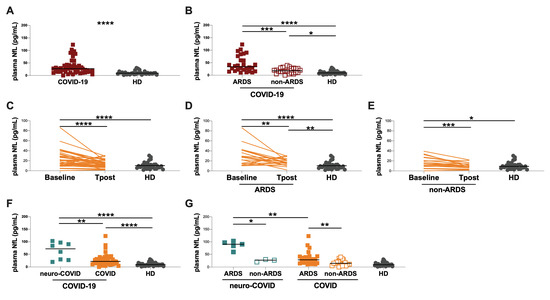Figure 2. Evaluation of plasma NfL levels in COVID-19 patients and healthy donors. (A) Evaluation of plasma NfL levels in COVID-19 patients and HD. (B) Evaluation of plasma NfL levels in patients with ARDS (ARDS group), patients without ARDS (non-ARDS group) and HD. (C) Longitudinal evaluation of plasma NfL levels in COVID-19 patients. (D) Longitudinal evaluation of plasma NfL levels in COVID-19 patients who developed ARDS during hospitalization. (E) Longitudinal evaluation of plasma NfL levels in COVID-19 patients who did not developed ARDS during hospitalization. (F) Evaluation of plasma NfL levels in COVID-19 patients with severe neurological symptoms (neuro-COVID group), COVID-19 patients without severe neurological symptoms (COVID group) and HD. (G) Evaluation of plasma NfL levels in neuro-COVID and COVID groups stratified according to ARDS. Horizontal lines represent medians. COVID-19: coronavirus disease 2019; neuro-COVID group: COVID-19 patients with severe neurological symptoms; COVID group: COVID-19 patients without severe neurological symptoms; NfL: neurofilament light chain; HD: healthy donors; ARDS: acute respiratory distress syndrome; CSF: cerebrospinal fluid. ****: p < 0.0001; ***: 0.0001 < p < 0.001; **: 0.001 < p < 0.01; *: 0.01 < p < 0.05.
