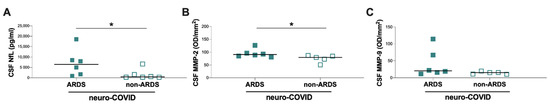 As reported in Figure 1B, COVID-19 patients were stratified according to disease severity into ARDS and non-ARDS groups. ARDS was defined according to the 2012 Berlin criteria [43]. Both neuro-COVID and COVID groups were further stratified according to disease severity (Figure 1B). Finally, neuro-COVID group was stratified based on the detection of SARS-CoV-2 RNA in CSF and plasma samples (Figure 1B), and the differences in CSF NfL levels as well as MMP-2 and MMP-9 activity were evaluated.