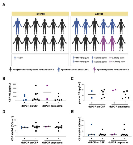 Figure 4. Detection of SARS-CoV-2 RNA on CSF and plasma samples and evaluation of NfL and MMPS levels in neuro-COVID group. (A) Among COVID-19 patients with neurological symptoms (neuro-COVID group), the detection of SARS-CoV-2 RNA on CSF and plasma samples was performed using RT-PCR and ddPCR. (B) Evaluation of CSF NfL levels in COVID-19 patients with severe neurological symptoms (neuro-COVID group) stratified according to ddPCR positivity on CSF and plasma. (C) Evaluation of plasma NfL levels in COVID-19 patients with severe neurological symptoms (neuro-COVID group) stratified according to ddPCR positivity on CSF and plasma. (D) Evaluation of CSF MMP-2 levels in COVID-19 patients with severe neurological symptoms (neuro-COVID group) stratified according to ddPCR positivity on CSF and plasma. (E) Evaluation of CSF MMP-9 levels in COVID-19 patients with severe neurological symptoms (neuro-COVID group) stratified according to ddPCR positivity on CSF and plasma. Horizontal lines represent medians. SARS-CoV-2: severe acute respiratory syndrome coronavirus 2; RT-PCR: reverse transcription-polymerase chain reaction; ddPCR: droplet digital polymerase chain reaction; CSF: cerebrospinal fluid; NfL: neurofilament light chain; MMP-2: matrix metalloprotease-9; MMP-9: matrix metalloprotease-9.