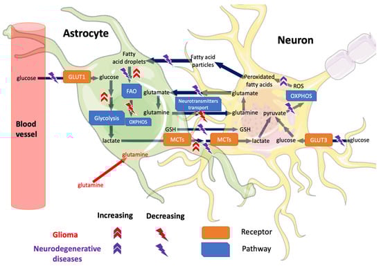 Lower grade gliomas (LGG), a less aggressive glioma form than GBM, is more heterogeneous in prognosis and response to treatment and is characterised by lower proliferation speed [9]. More than 80% of LGG have mutations in isocitrate dehydrogenases that play a central role in metabolism as catalysing reaction in the Krebs cycle, redox homeostasis, biosynthesis of lipids, and glutamine metabolism [9,10]. These LGG are classified into astrocytoma (AST) and oligodendroglioma (ODG) based on the glial cell type they originated from. GBM and LGG also have different preferred energy sources. Glucose, the main fuel of neurons [11], and glutamine, required for the biosynthesis of neurotransmitters [12], are abundant in the brain microenvironment and have been linked to GBM invasion [13,14]. The Warburg effect is a hallmark of GBM with a shift from oxidative phosphorylation (OXPHOS) and TCA cycle to glycolysis for energy production [15]. The upregulation of glycolysis and downregulation of OXPHOS and TCA is linked to poor survival in GBM [16]. This increased glycolysis rate, even under hyperoxia, increases GBM chemoresistance [17]. Furthermore, this metabolic shift allows channelling carbon and nitrogen fluxes into the biosynthesis of nucleotides via the pentose phosphate pathways (PPP) [18]. The PPP also permits reducing NADP+ to NADPH and hence maintains oxidative homeostasis [18]. A lesser-known GBM subtype, mitochondrial GBM, was identified by multi-omics analysis with decreased glycolysis and increased OXPHOS (reverse Warburg effect) [19]. This reverse Warburg effect occurs in late tumour formation and is characterised by sensitivity to OXPHOS inhibitors [19]. Neuron-glioma metabolic interactions through neurotransmitters can change glioma progression [20]. Mainly, dysregulation in neurotransmitter exchange such as of glutamine and gamma-aminobutyric acid (GABA) emerges as part of the GBM metabolic remodelling [20]. Glutamine, a neurotransmitter precursor, is required in glycolytic cells to fuel the TCA cycle and the biosynthesis pathways. Unlike GBM, LGG shows low glycolysis [21], which may explain their relative decreased proliferation and ODG growth is robust to glutamine starvation [22]. Similarly, GABA may be linked to increased GBM stemness [23] where the pharmacological inhibition of GABA release of the GBM cells reduced GBM growth [24]. The main astrocyte-neuron metabolic interactions under healthy conditions in addition to glioma and NDD are summarised in Figure 1.