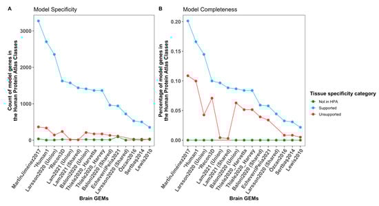 To evaluate the specificity and the completeness of the human brain GEM, tissue gene categories were retrieved from the Brain Atlas [89] of the Human Protein Atlas (HPA) [90]. HPA classifies the protein-coding genes into five categories according to the expression level in a target tissue compared to other tissues. These categories were retrieved for the human brain and mapped to the ENTREZ identifiers. The five categories were grouped for simplification into two types: Supported (which includes “Elevated in brain”, “Elevated in other but expressed in brain” and “Low tissue specificity but expressed in brain”), and unsupported (which includes “Not detected in brain” and “Not detected in any tissue”). The different HPA data were mapped to the genes of the brain GEM, and to two generic models, Recon3D and Human1, to assess the fraction of genes of each model that are supported or unsupported in the brain by the HPA protein data. Two scores were calculated for each brain GEM, specificity and completeness. Model specificity (indicated as two numbers) is the number of supported or unsupported genes in each GEM. In contrast, model completeness is the ratio of the model supported or unsupported genes to the total count of genes in each category.