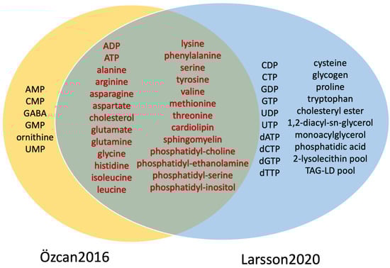 Only Özcan2016 and Larsson2020 are modelling high-proliferative cells, and, accordingly, they used the biomass reaction as an OF. While Larsson2020 used the generic biomass function included in all HMR reconstructions, Özcan2016 built a tailored biomass function for glioma that could be adapted to future GBM models. Özcan2016 added to the healthy Sertbaş2014 24 pseudo reactions and a final biomass reaction for which the coefficients were adjusted in function of the contribution of each cell type of the white matter (94% in glial and 6% in neuron). By comparing the metabolite composition of the two OFs, we identified some differences between the two models, notably, GABA and ornithine present uniquely in Özcan2016 and, glycogen, cysteine, proline, and tryptophan (included in the generic biomass function of Larsson2020) (Figure 3). In addition, Larsson2020’s OF shows a higher diversity of phospholipids than Özcan2016, as the former is reconstructed from the generic HMR2 that covers the lipid metabolism exhaustively [107]. The neurotransmitter GABA, which is missing in the Larsson2020’s OF, was shown to control the proliferation and growth of glioma [24]. Meanwhile, glycogen, which is absent in Özcan2016’s OF, is required for cancer cell survival [125] and optimal glucose utilisation under hypoxia conditions [126]. As a result, GABA and glycogen should be potentially added to future GBM OFs.