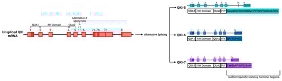 The Quaking (QKI) locus expresses alternatively spliced RNA-binding proteins belonging to the signal transduction and activation of RNA (STAR family).A schematic displaying the three major isoforms of QKI, namely, QKI-5, QKI-6 and QKI-7, yielded from the alternative splicing of the QKI gene, displayed with both exons and introns.
