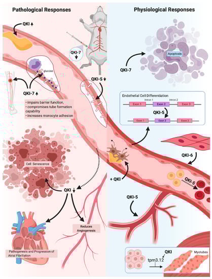 A schematic overview of the critical pathological and physiological responses the (cardio)vascular system exhibits in response to the three major Quaking (QKI) isoforms. QKI expression is known to drastically increase in response to vascular injury, suggesting reparative roles of the QKI isoforms. QKI reduction results in an inhibition of angiogenic and proliferative capabilities, as well as promotes cell senescence. Reduction in atrial myocytes specifically results in atrial fibrillation, whilst a lack of QKI-5 in endothelial cells (ECs) greatly impairs cell-to-cell adhesions and barrier function. QKI expression has also been shown to be vital in numerous cellular processes, including angiogenesis, erythropoiesis and EC, vascular smooth muscle cells (SMCs) and myotubule differentiation. In addition, QKI expression can ameliorate pathogenic fibroproliferative responses to vascular injury, whilst QKI-5 and QKI-6 expression is able to improve vascular cell qualities. Overexpression of QKI-7, however, has been shown to induce apoptosis and to drastically impair EC function, indicating a pathogenic role of QKI-7 expression within the (cardio)vascular system. The QKI isoforms therefore have great promise for use in vascular therapy due to their vital roles within (cardio)vascular health and disease states.