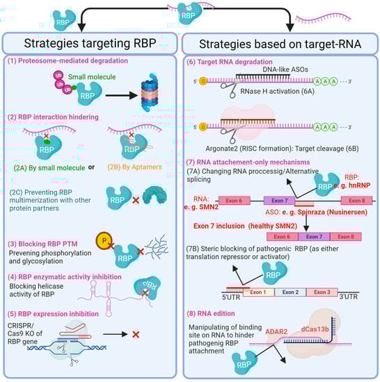 As discussed, RBPs typically fall into one of two categories: pathogenic or protective. Based on this, efforts of designing RNA-based therapeutics should be focused on mimicking protective RBPs or inhibiting pathogenic RBPs to restore health and prevent disease-causing function, respectively. Every RBP has unique domains to bind its target RNAs in sequence-dependent fashion with structural conformation [30]. This provides therapeutic opportunity by developing drugs able to target specific RBPs or an RBP-RNA interaction (Figure 4) thereby limiting disease progression. To this end, attractive emerging potential RNA-based therapeutics include anti-sense oligonucleotide (ASO), aptamers, small interfering RNAs duplex (siRNAs), microRNAs, synthetic mRNAs as well as some CRISPR/Cas technologies (comprehensively reviewed by [104]). These therapeutic interventions can lead to the favourable knockdown/degradation or overexpression of specific target RNAs; alter the splicing by-product of pre-mRNA via masking the splice site or recruitment of splicing factors; prevent translation of mature mRNA by hindering its attachment to the ribosome; or modify the sequence of RNA by editing mutated RNA or inserting a mutation into the RNA to restore or prevent binding of a specific RBP, respectively [104,105].
