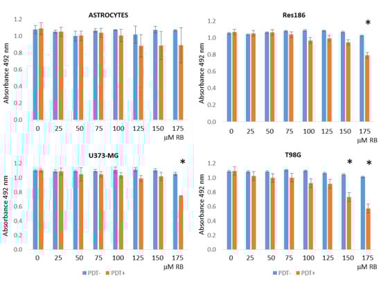 Cell viability MTS assays following RB and PDT treatments. Low- (i.e., Res186) and high-grade (U373-MG and T98G) human astrocytoma cells lines and normal rat primary astrocytes were treated with different concentrations of RB (0, 25, 50, 75, 100, 125, 150 and 175 μM for 24 h) exposed (PDT+) or not (PDT−) to 562/576 nm irradiation for 5 min. Colorimetric MTS analysis, measured as absorbance at 492 nm, was carried out after 24 h p.t. All experiments were performed in triplicates with independent assays. Asterisks indicated statistical significance compared to related PDT- cells (p < 0.05, Anova one-way; SD are highlighted as vertical bars).