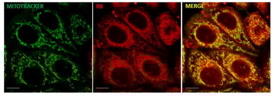 Following RB (25 μM) internalization after 24 h p.t., as reported in Figure 3, RB was mostly localized within mitochondria, according to RB and MitoTracker (Invitrogen) staining and revealed by confocal microscope examinations in living T98G cells.
