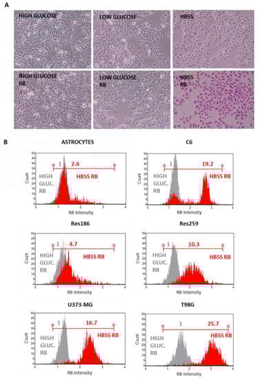 Amino acids starvation-induced uptake of RB in different cell lines. (A) T98G cells were incubated or not for 24 h with RB (12.5 μM) in standard DMEM high glucose (D-glucose = 4500 mg/L), DMEM low-glucose (D-glucose = 1000 mg/L) or HBSS amino acids-depleted media and visualized after 24 h p.t. using a Nikon Eclipse TS100 inverted microscope at 10× magnification. NT = RB untreated cells in standard high glucose medium. (B) Similar RB incubation experiments were performed in normal rat astrocytes, rat C6 glioma, low- (Res186-Res259) and high-grade astrocytoma cells (U373-MG and T98G). After incubation, cells were trypsinized and analyzed for RB fluorescence intensity using the Guava Muse Cell Analyzer (Luminex, Laser = 532 nm; Filter = 576 ± 14 nm). Each plot was obtained analyzing 5000 cells and normalized to the corresponding RB intensity in standard high glucose (RB = 1) and compared to fold differences in HBSS RB conditions.