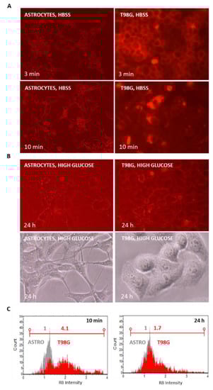 RB intracellular measurements in normal rat astrocytes and T98G cells following amino acids starvation to standard growing conditions. (A) Cells were incubated with RB (12.5 μM) in HBSS media and visualized at 3 and 10 min p.t. using a Nikon Eclipse TS100 inverted fluorescence (20×) or optical microscope at 40× magnification (G2A blocking filter; exc. = 535/50 nm; dichr. mirr. = 577 nm; barrier = 580 nm). (B) After reconditioning for 24 h with standard high glucose media, cells were visualized as above under fluorescence and optical microscope. (C) In parallel, trypsinized cells (n = 5000 each) were analyzed in RB intensity using a Guava Muse Cell Analyzer (Luminex, Laser = 532 nm; Filter = 576 ± 14 nm), comparing intensity plots at 10 min vs. 24 h (astrocytes in gray; T98G in red). RB intensity values are normalized to astrocytes RB at 10 min (RB = 1).