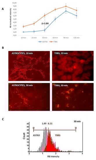 After this evidence, experimental variables were analyzed to set up a protocol in order to (a) increase RB uptake by amino acids starvation, thus reducing the RB molar amount of administration; (b) pharmacologically block the extracellular release of RB by GW4869; and (c) identify suitable PDT time-interval conditions to efficiently stimulate RB photo-activation in astrocytoma cells vs. normal astrocytes. Primarily, RB (12.5 μM) internalization during HBSS starvation was monitored in living astrocytes and T98G cells at different time points (i.e., 10–20–30–60–90–120 min p.t.) by cytofluorimetric evaluations. As reported in Figure 8, the highest difference between normal rat astrocytes and T98G cells in RB internalization was scored after 30 min of HBSS starvation (T98G scored a 3.84 fold difference in RB intensity compared to astrocytes; 6.11 vs. 1.89, respectively), while for longer starvation intervals, the graphs showed similar trends.