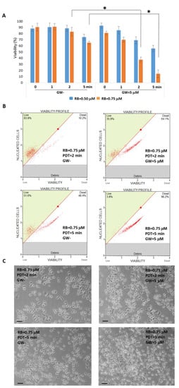 Viability assays following RB starvation, PDT exposition and GW4869 administration in T98G cells. (A) Cytofluorimetric viability graph of T98G cells (n = 2000) incubated with RB concentrations (i.e., 0.50 and 0.75 μM) for 30 min in HBSS media, with or without GW4869 (GW = 5 μM), combined with different PDT exposition times (i.e., 0–1–2–5 min at 562/576 nm), after 24 h in standard growing conditions (high glucose media). Asterisks indicated statistical significance compared to GW cells (p < 0.05, ANOVA one-way; SD are highlighted as vertical bars). (B) Examples of cytofluorimetric viability plots and (C) optical microscope examinations of RB (0.75 μM), with/without GW4869 and PDT (2–5 min at 562/576 nm). Scale bars = 30 μm.