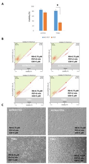 Viability assays comparison following RB starvation, PDT exposition and GW4869 administration in normal rat astrocytes and T98G cells. (A) Astrocytes and T98G cells were incubated with RB = 0.75 μM for 30 min in HBSS starvation, which was followed by PDT exposition of 0 or 2 min at 562/576 nm, administration of GW4869 (GW = 5 μM) in reconditioning standard media for 24 h. Asterisk indicated statistical significance compared to not PDT exposed cells (p < 0.05, ANOVA one-way; SD are highlighted as vertical bars). Viability graphs and plots were obtained using Guava Muse Cell Count & Viability kit (Luminex) analyzing 2000 cells each of two independent experiments. (B) Examples of cytofluorimetric viability plots and (C) optical microscope examinations (Nikon Eclipse T100, magnification 10×) of astrocytes and T98G PDT-untreated and -treated cells at 24 h p.t.
