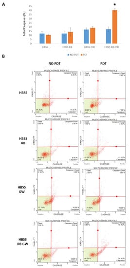 Subsequently, the molecular pathways involved in the decrease in viability were investigated in T98G cells. In particular, the induction of apoptosis was analyzed by cytometry by means of the Guava Muse Multicaspase kit (Luminex). As a result, the highest mean score of caspases activation was reported in HBSS RB + GW+ PDT sample (38.90%), compared to RB + GW one (15.15%). Importantly, single treatments (i.e., starvation by HBSS, PDT exposition, RB or GW administration) did not produce significant differences in caspases activation (Figure 11).