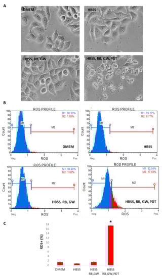 Oxidative stress analysis of T98G cells following RB starvation, PDT exposition and GW4869 administration scheme. Cells were grown in standard DMEM high-glucose medium, starved for 30 min in HBSS media, treated with RB (0.75 μM) and GW4869 (GW = 5 μM), and exposed or not to PDT (2 min at 562/576 nm). (A) Cells were visualized using optical microscope at 20× magnification (Nikon Eclipse TS100). (B) Trypsinized cells were finally analyzed after 24 h p.t. in standard growing media for ROS+ production using the Guava Muse Oxidative Stress kit (Luminex). (C) The histogram of percentages of ROS+ (i.e., M2 gates) events of two independent experiments is reported (n = 3000 each). Asterisk indicated statistical significance comparing HBSS, RB, GW and PDT-exposed cells to the other samples (p < 0.05, ANOVA one-way; SD are highlighted as vertical bars). M1 and M2 gates, respectively for ROS− and ROS+ events, were established on untreated cells in DMEM high-glucose standard growing condition and adopted for all samples.