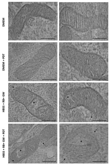 Ultrastructural analysis by Transmission Electron Microscopy (TEM) conducted in untreated T98G cells grown in standard conditions without or with PDT stimulation (2 min at 562/576 nm) and following HBSS starvation (30 min) with RB (0.75 μM) and GW4869 (5 μM), again, without or with PDT stimulation, revealed morphological difference in mitochondria (Figure 13). In detail, HBSS, RB and GW4869 combined treatment revealed partial cristae disarrangement, cristolysis with a reduction in the mitochondrial matrix density and of the integrity of the outer membranes of the organelles; these degradative features were further increased following PDT exposition. Importantly, PDT stimulation per se did not produce significant mitochondria damages.