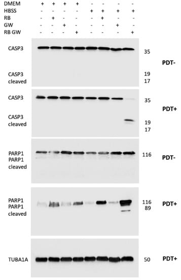 Expression of apoptotic markers in T98G cells following RB starvation, PDT exposition and GW4869 administration scheme. Caspase 3 (CASP3, revealed by anti-Caspase 3 antibody, Cell Signaling, #9662), PARP1 (Cell Signaling, #9532) and α-tubulin (TUBA1A, Cell Signaling, #2144) proteins expression in untreated standard growing (DMEM) or HBSS starvation, with/without RB (0.75 μM), GW4869 (GW = 5 μM), PDT stimulation (2 min at 562/576 nm), after additional 24 h p.t. in standard growing conditions. For each sample, 40 μg of total protein extracts was loaded into 12% polyacrylamide gels. All the experiments were performed in duplicates with independent assays. A representative experiment is shown. Molecular weights in KDa are reported.