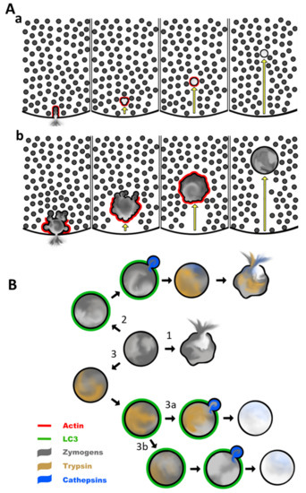 Another scenario is illustrated by pathway 2 in Figure 2B; LNCA could precipitate fusion with a lysosome, (i.e., formation of autolysosome), activation of trypsinogen by lysosomal hydrolases, (e.g., cathepsin B [25]) and finally rupture of the endocytic vacuole, releasing trypsin and cathepsins into the cytosol. This pathway illustrates a putative damage-inducing role of LNCA. The presence of TAP in LC3-conjugated endocytic vacuoles has been observed experimentally [9]; this strongly suggests the presence of trypsin in these organelles and is consistent with pathway 2. It is, however, also conceivable that LC3 conjugation plays a protective role. Such a hypothetical protective role is illustrated by pathways 3a and 3b in Figure 2B. In pathway 3a, activation of trypsinogen occurs independently of the LC3 conjugation. This could occur as a result of trypsinogen autoactivation (likely modulated by chymotrypsin C) [115] in the environment of the endocytic vacuole. An alternative mechanism is trypsinogen activation by cathepsin B, reported to co-localise with trypsinogen in secretory organelles of the intact acinar cells [90,91]. Following the aberrant endocytosis triggered by inducers of pancreatitis, cathepsin B could be retained in the endocytic vacuoles together with trypsinogen and contribute to the trypsin formation [13]. The role of the LC3 conjugation at this juncture is in initiating lysosomal fusion and the consequent destruction of trypsin and other digestive enzymes by the lysosomal hydrolases “sanitising” the content of the endocytic vacuole. Cathepsin L is a putative candidate for trypsin and trypsinogen cleavage [116] in this organelle and could potentially fulfil the protective role associated with pathway 3a. The balance between cathepsin B (trypsinogen activating protease) [25] and cathepsin L (protease degrading trypsinogen and trypsin) [116] could determine the dynamics of the trypsin levels in endocytic vacuoles. Notably, the presence of membrane-bound lysosomal proteins on endocytic vacuoles has been reported [13], suggesting the progression of endocytic vacuoles to autolysosomes. The sanitised content of the autolysosome, (i.e., the products of hydrolysis by lysosomal enzymes) could be exported into the cytosol by autolysosomal transporters and reutilised by the cell. Alternatively, the content of these organelles could be released from the cell via exocytosis. Indeed, the fusion of endocytic vacuoles with the plasma membrane and exocytosis has been observed [109]; however, we do not know the evolutionary stage of the fusing vacuoles or their content, (e.g., it could be zymogens, active proteases or the products of digestion).